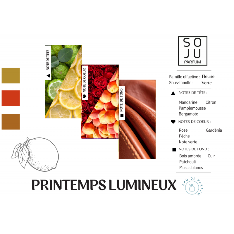 La Bergamote et les Agrumes, en notes de tête, se fondent dans une délicate note de cœur de Rose, de Freesia et de Fruits de la Passion, le tout adouci par le Patchouli et le Bois ambré.