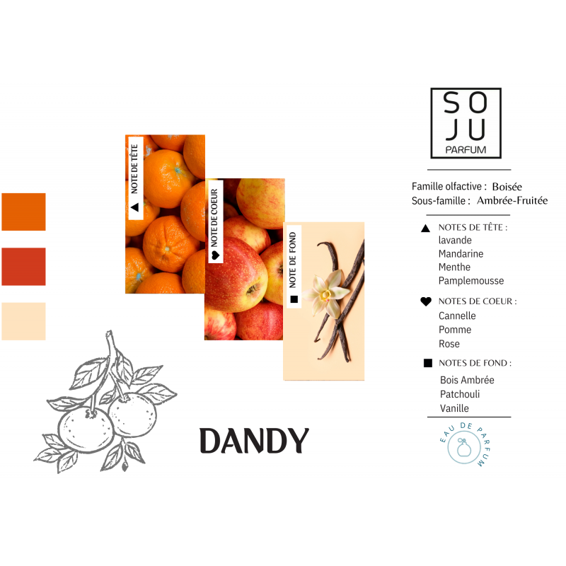 La fraîcheur fruitée de la Mandarine et de la Menthe en note de tête donne un départ pétillant, le cœur de Rose et de Cannelle se révèle intense pour enfin laisser un sillage original au charme insolent avec les Bois Ambrés et le Vétiver